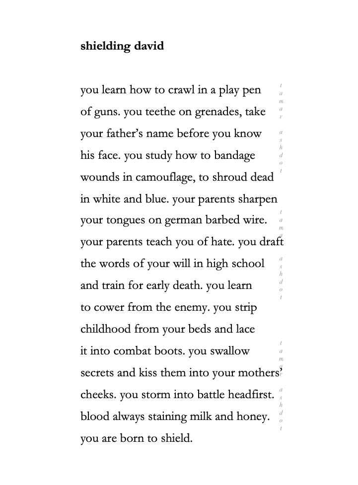 “shielding david,” was one of the first poems that I crafted in Intermediate Poetry Workshop during my second semester of college in spring 2015. I was still visiting Israel frequently — the trip and destination’s dread residually leaving me, prompting the beginning of my writing about Israel and my father. Unknowingly, I was drafting a poem that would anchor my 10-year-in-the-making poetry collection about my father and his death.