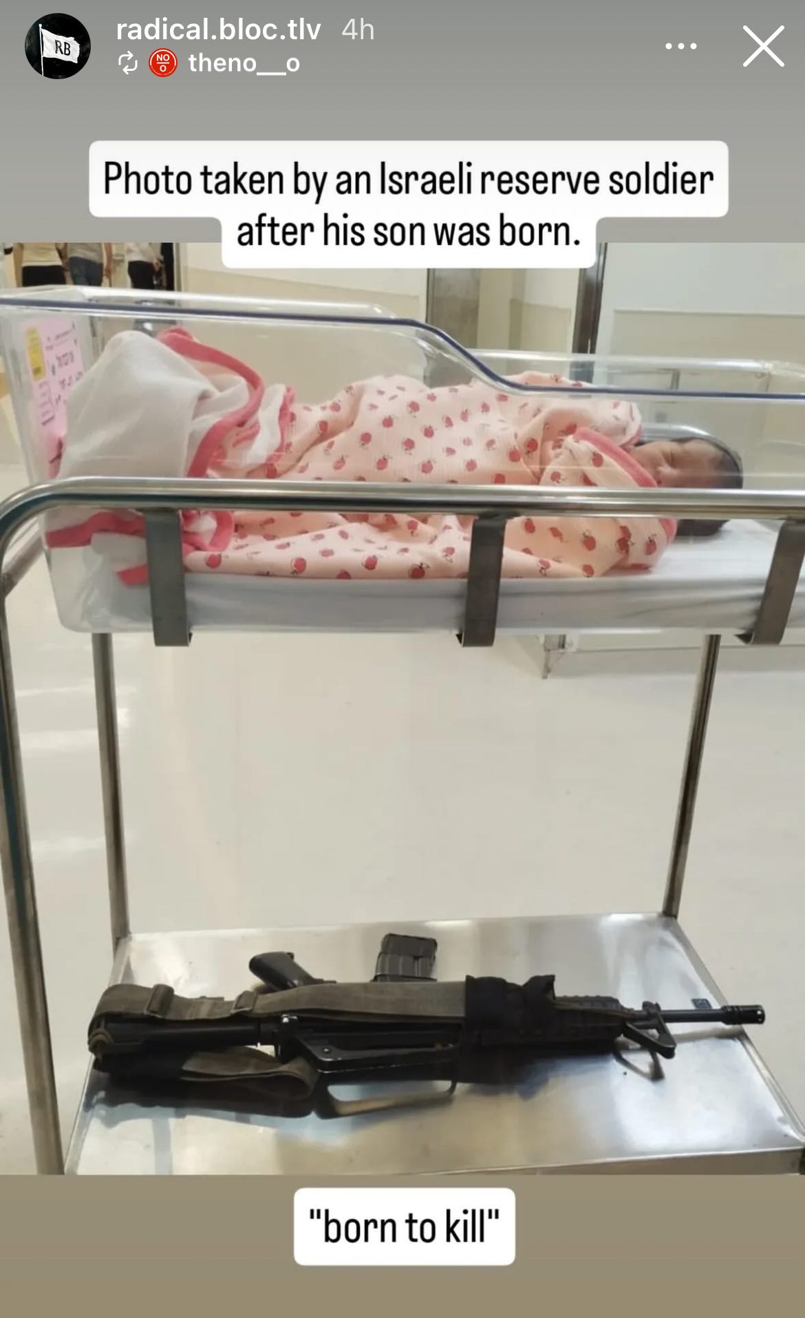 In the photo above, posted by the Radical Left (Anti-Occupation) Movement in Israel in May 2025, an Israeli Defense Forces reserve soldier is visiting his newborn son in the hospital. Below the soft, tiny infant in the bassinet, lays the father’s rifle. The photo is captioned “born to kill.”