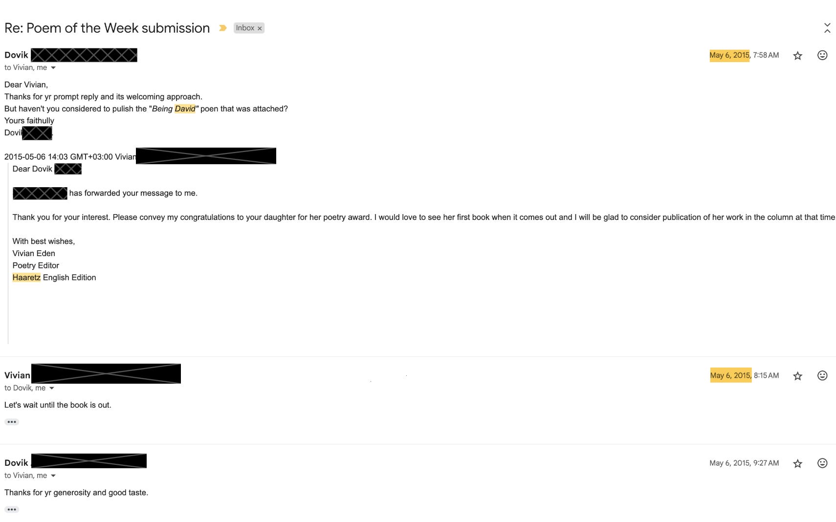 It was a poem my father loved so much, he emailed Haaretz himself to ask for it to be published.